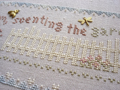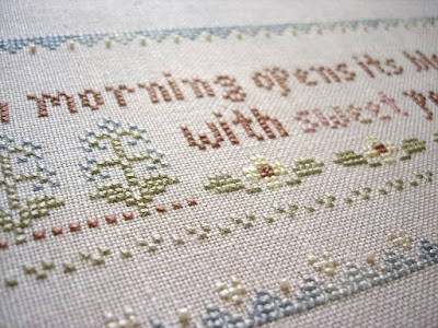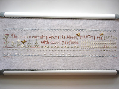 For those familiar with Mirabilia designs, I'm sure you can tell at a glance with the amount of stitches put in so far that it's Garden Verses. The fabric is Silkweaver's Wandering Ivy Reflections 32 count Jazlyn. This is my first time stitching on Jazlyn as well. I find it very similar to lugana. Perhaps a little softer but the difference is minimal.