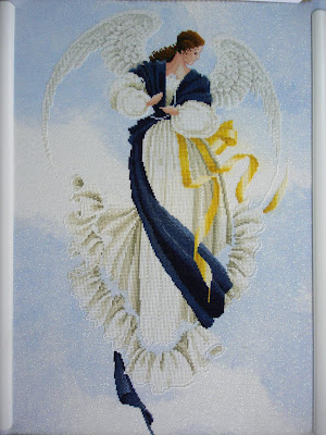 Anyway, notice that I mention that this is still a WiP? To anyone who is unfamiliar with the design, Esperanza is, in all appearance, completed. However, I assure you that is not the case. There are still some confetti stitches around her head and sides that I have yet to stitch. The design supposedly calls for DMC gold metallic thread which in my usual style, I've substitute with Kreinik 002HL Very Fine #4 Braid. In my opinion, it sparkles more ^.^ Now, can you believe I've used up nearly a full spool of it just on the harp and the strip of gold near her hemline? I'm afraid I won't have enough for the confetti stitches. Thus, I've decided to bead those stitches instead. I think that will give the design a more interesting depth. Since I won't be doing the beading until I'm ready to have her framed up, I guess Esperanza will remain a WiP for a while yet.
